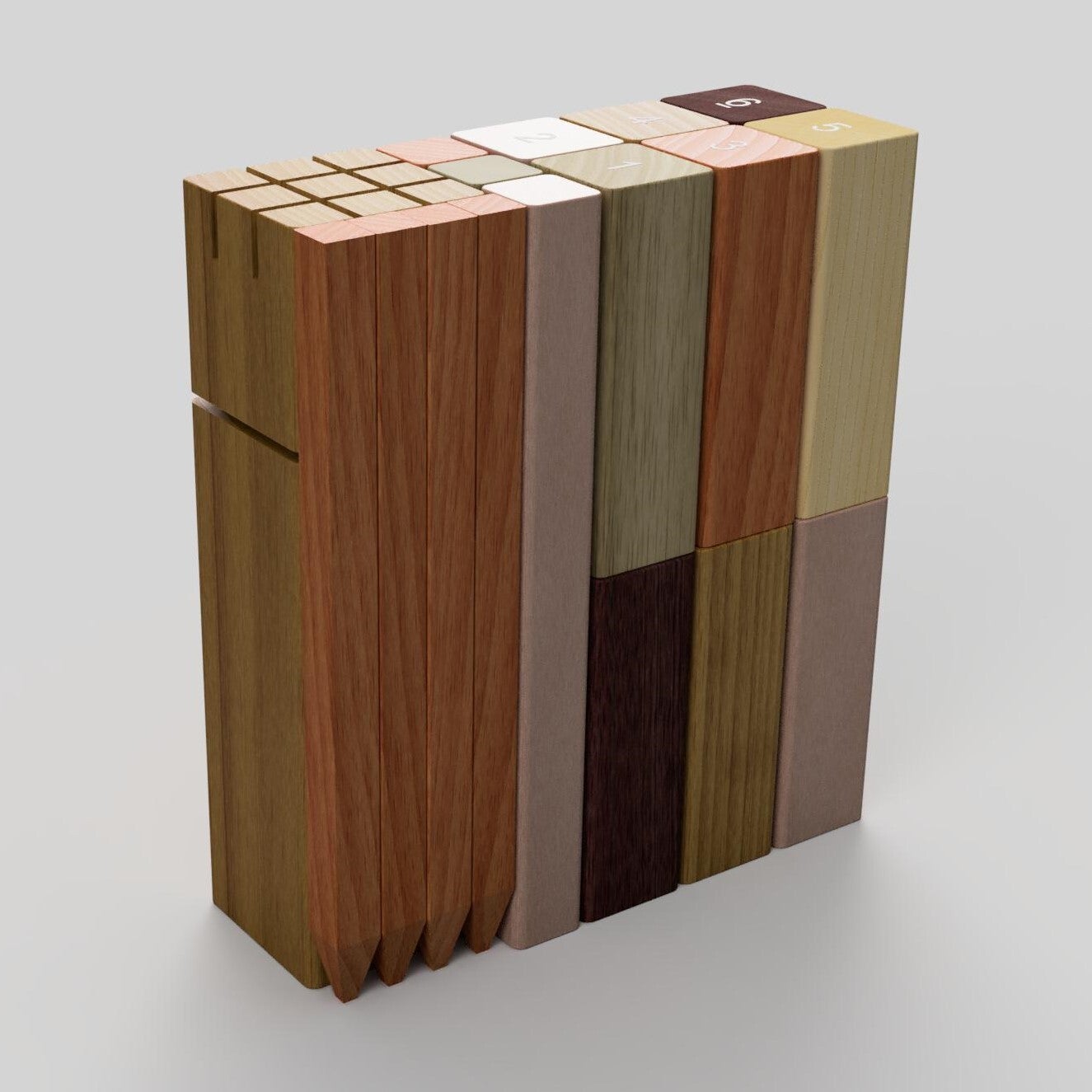 For Jadimex I created a kubb set out of waste material. The result is a beautifull kubb/möllky set made of different sorts of tropical wood, depending on the stock waste.